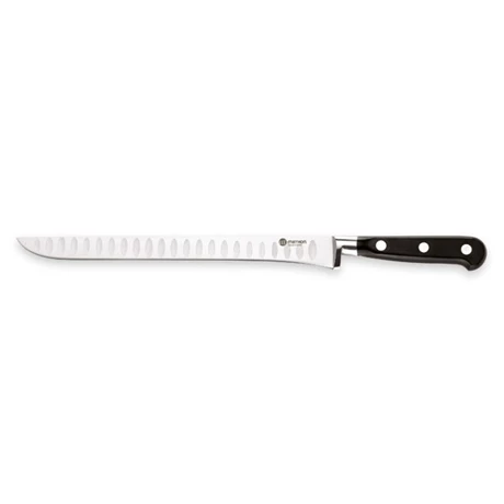 Avec sa lame de 25 cm, le couteau à jambon alvéolé Mathon Les Spécialistes est idéal pour trancher de belles tranches de jambon blanc, cuit ou fumé. Il fait partie d’une ligne de couteaux de type professionnel pour un usage quotidien.