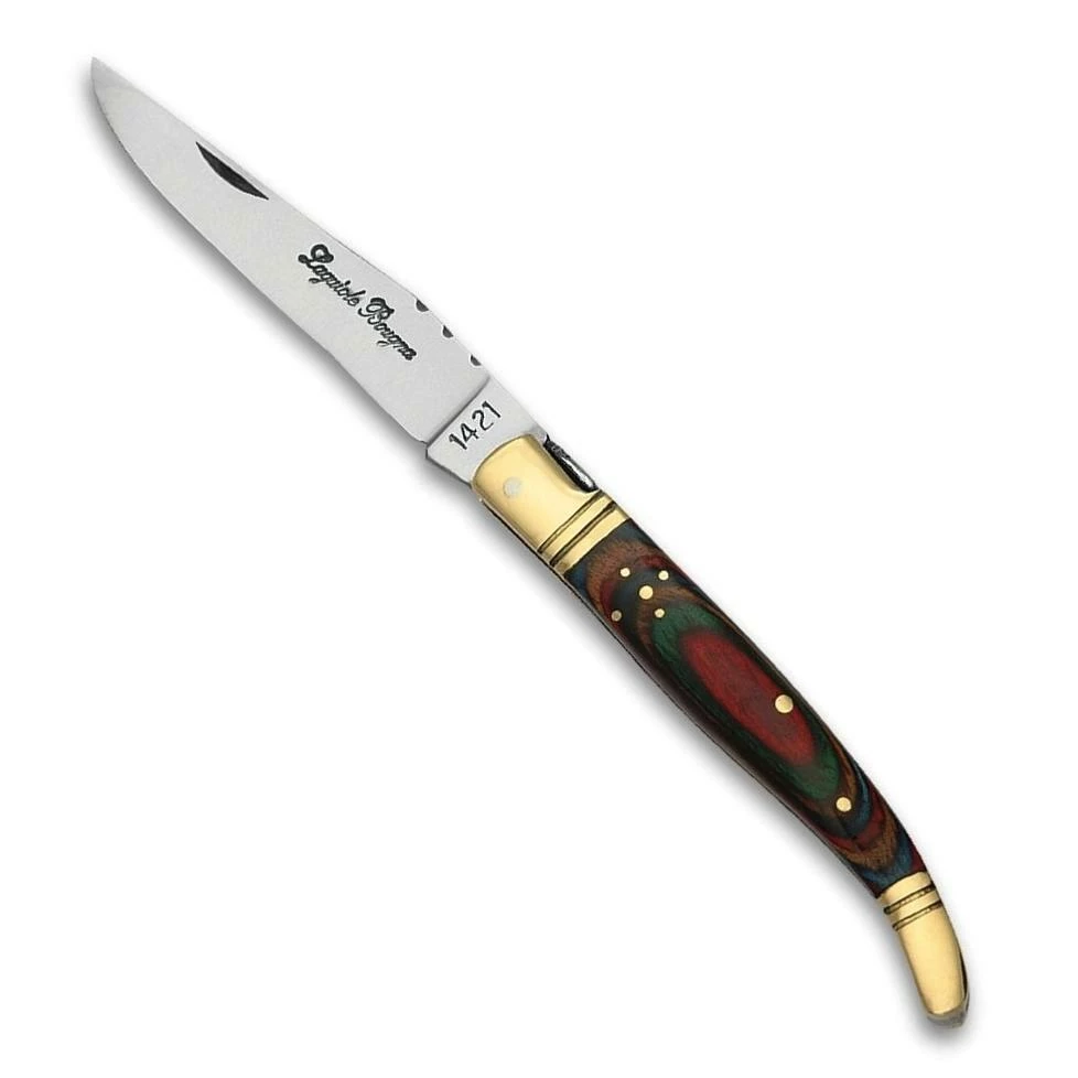 Couteau Laguiole Bougna 5342 collection multicolore, lame en acier inox longueur 8 cm et manche en bois multicolore par couches superposées. Mitre en laiton.