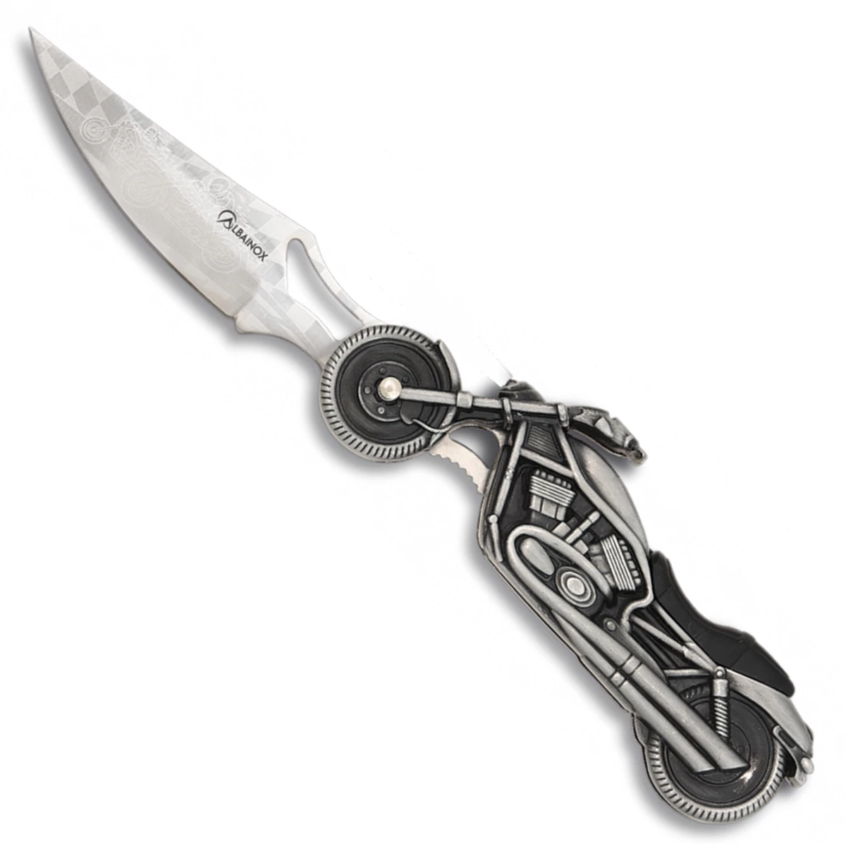Couteau pliant Albainox 10938, lame acier inox longueur 9 cm avec décoration laser et manche en aluminium représentant une moto avec lampe intégrée dans le phare.