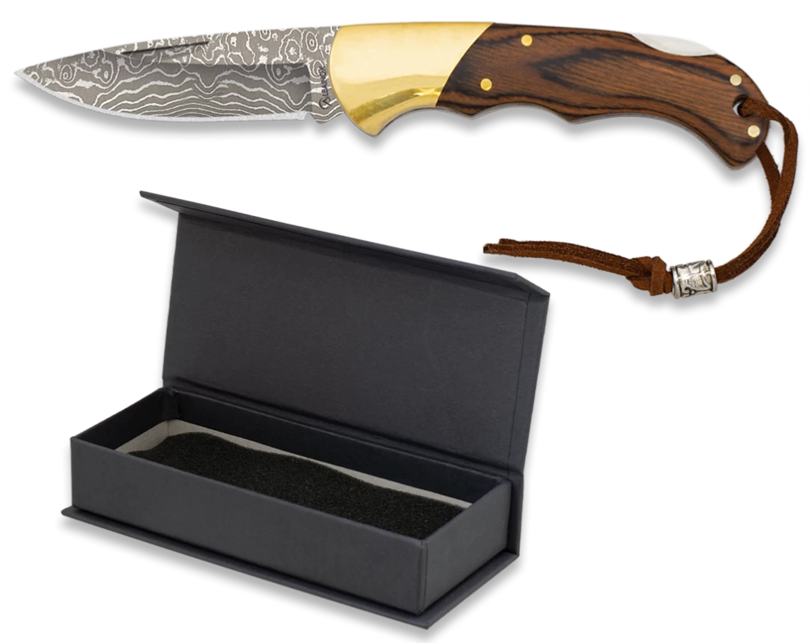 Couteau pliant damas 18750, lame en damas longueur 7.5 cm. Manche en bois et virole en laiton.