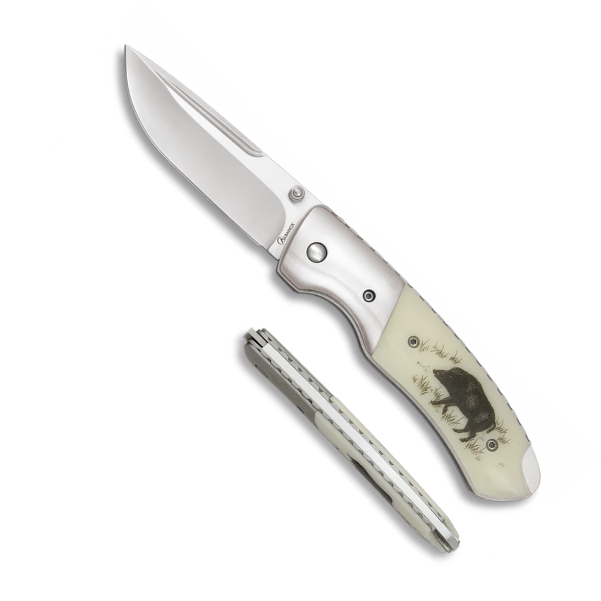 Couteau pliant de luxe décor SANGLIER 19468 : Lame en inox longueur 8 cm, manche en aluminium et PVC avec décor sanglier.