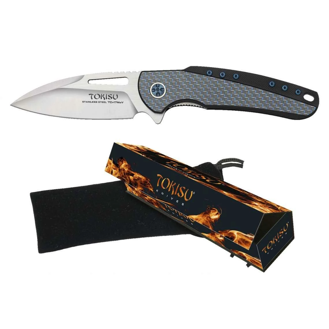Couteau pliant TOKISU 18771 lame ajourée en acier inox 7Cr17MoV longueur 8.8 cm épaisseur 3.4 mm finition satin CNC et brossée, manche G10 et fibre de carbone. Pivot en titane avec roulement Ă billes.