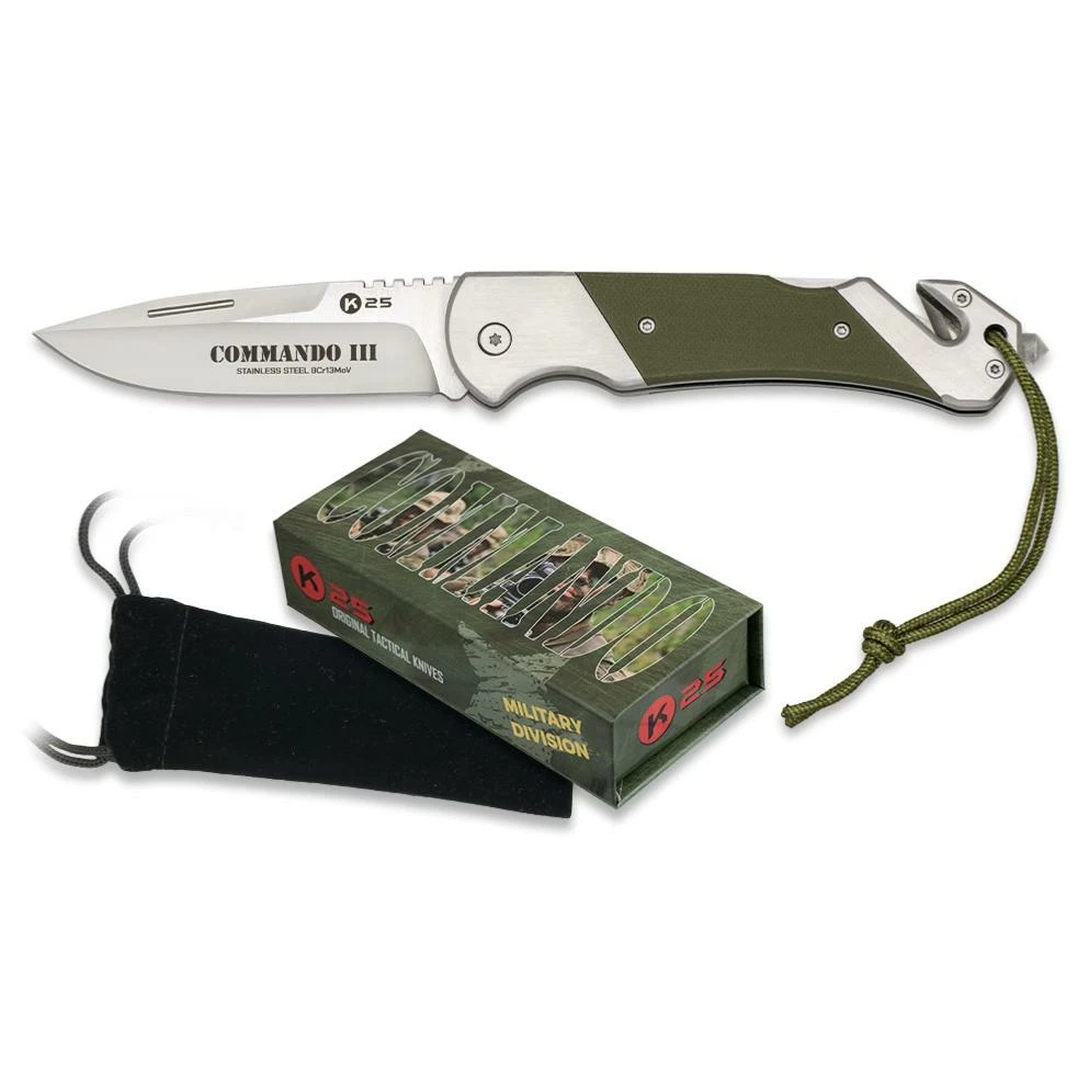 Couteau COMMANDO-II K25 18701, lame acier inox 8Cr13Mov longueur 9 cm, manche acier + G10 vert. Brise vitre et coupe ceinture. Cordon en polycuir.