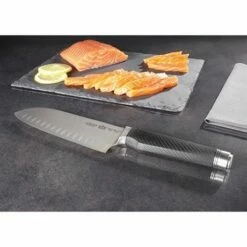 Le couteau Santoku tranchelard 16 cm FK2 est parfait pour rĂ©aliser des tranches fines de viande, jambon, poisson etc. La lame en soie monobloc de 16 cm est fine et souple pour un tranchant parfaitement net et efficace. En acier, elle est robuste et indĂ©formable. Le manche ergonomique est anti glisse pour une bonne prise en main et une plus grande sĂ©curitĂ© lors de la dĂ©coupe. Un système de contrepoids permet un bon Ă©quilibre pendant l’utilisation et la mitre Ă©paisse assure sa robustesse.Â