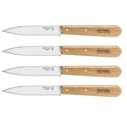 Ce set de 4 couteaux office lames crantĂ©es inox 10 cm couleur naturel comporte 4 petits couteaux polyvalents indispensables pour dĂ©couper, trancher prĂ©cisĂ©ment les fruits, tomates, saucissons, … Leur lame de 10 cm en acier inoxydable Sandvik mis au point pour Opinel est rĂ©putĂ©e pour son tranchant et sa facilitĂ© d’entretien. En hĂŞtre issu d’exploitations françaises, le manche est dur et rĂ©sistant. Recouvert d’une couche de vernis, il est protĂ©gĂ© contre l’humiditĂ© et les salissures.  Â