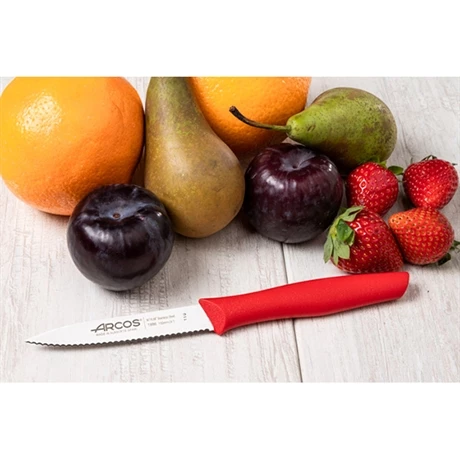 Le set contient 3 couteaux d’office rouges complémentaires : l’un a une petite lame courbée de 6 cm, le second une lame crantée de 10 cm et le dernier a une lame lisse de 10 cm. Ces couteaux de 20 cm sont fabriqués en Espagne. Arcos veille à la qualité des matériaux utilisés et trace ainsi son processus de fabrication.